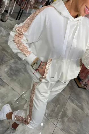 Crafted from high-quality polyester, this hooded sweatshirt and trousers set offers a sleek solid-color design available in versatile shades like white, black, and dark red. The long-sleeve top pairs seamlessly with full-length trousers for a comfortable, stylish fit.